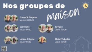 Nous voulons vivre notre foi et l’Église en partageant nos joies, nos larmes ou encore en priant les uns pour les autres et lire la Bible ensemble. C’est pour cela que nous aimons chaque semaine nous retrouver en petit groupe dans nos maisons. Chacun est libre de rejoindre le groupe qui lui convient le mieux.